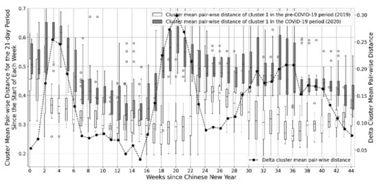 Even though Figure 9 indicates the change of the data generating distribution, it is also obvious that the electricity consumption in the COVID-19 period resumes to a nearly normal level a few weeks after the Chinese New Year. This is because economic activities resumed around April 2020 after the lock-down policies were lifted in most areas of the Zhejiang province. Therefore, it is interesting to study the time evolution of the difference between the two clustering results from the initial outbreak of COVID-19 to the period when the pandemic was under control. Figure 10, Figure 11 and Figure 12 show the boxplot comparisons of the cluster mean pairwise distance between the COVID-19 period and the pre-COVID-19 period for the three selected clusters. Each boxplot in the three figures represents the cluster mean pairwise distance of 21 consecutive days starting from the indicated week. This was to eliminate the effects of potential outlier days. Based on the definition of the cluster mean pairwise distance shown in Section 3.5.4, if there was no COVID-19 pandemic, the cluster mean pairwise distance of 2020 should have remained small and similar to that of 2019. However, COVID-19 has changed the electricity consumption pattern, so the previous hypothesis does not hold, as shown in the three figures below. In addition, the evolution was similar for the difference of the cluster mean pairwise distance between the two periods (named “delta cluster mean pairwise distance”) in all three figures. Some observations include: