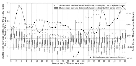 Boxplot comparison of the cluster mean pairwise distance of cluster 5 between the COVID-19 period and the pre-COVID-19 period (each green or blue boxplot represents the cluster mean pairwise distance for the 21-day period from the indicated week on the x-axis; delta cluster mean pairwise distance is the difference between the cluster mean pairwise distance of the COVID-19 period and the pre-COVID-19 period).