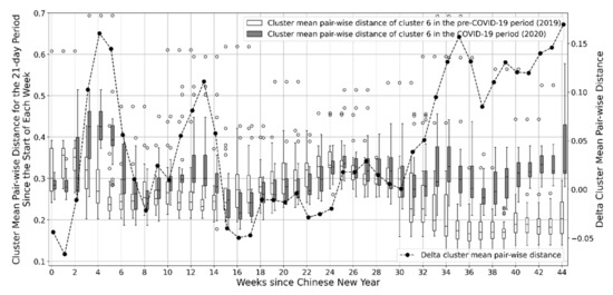 Boxplot comparison of the cluster mean pairwise distance of cluster 6 between the COVID-19 period and the pre-COVID-19 period (each green or blue boxplot represents the cluster mean pairwise distance for the 21-day period from the indicated week on the x-axis; delta cluster mean pairwise distance is the difference between the cluster mean pairwise distance of the COVID-19 period and the pre-COVID-19 period).