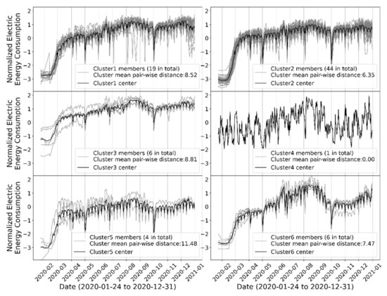 The analysis in this section was conducted based on the clustering results using the data from the COVID-19 period. The clustering method used in this section is the same as the previous section, but the clustering was based on the COVID-19 period data. Figure 13 shows the clustering result. Compared with the pre-COVID-19 clustering result, the VRI (the metric presented in Section 3.5.5) is 0.65, indicating the cluster labels differ significantly between the pre-COVID-19 clustering result and COVID-19 clustering result. This again shows the pandemic has changed the electricity consumption pattern. Figure 13 shows that the COVID-19 period data are mainly grouped into two clusters (cluster 1 and cluster 2), and the other clusters have very few members. Therefore, the two major populated clusters are used in this study. The two clusters differ mainly during the recovery period when the electricity consumption climbs around March 2020.