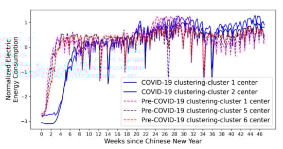 Figure 14 further plots the cluster centers of clusters 1 and 2 in Figure 13 and the centers of the three major clusters in the pre-COVID-19 clustering result (as shown in Figure 7). It is shown that, for the COVID-19 period data, the electricity consumption of cluster 2 starts to recover at around week #2.5 while cluster 1 starts to recover one week later than that. In addition, the recovery speed (the slope of the electric consumption) of cluster 2 is faster than that of cluster 1. The electricity consumption of cluster 2 from the COVID-19 clustering reaches the previous year’s level at around week #8, while cluster 1 reaches the previous year’s level at around week #10. Compared with the pre-COVID-19 clustering, the curves in the COVID-19 period are delayed by more than four weeks. For cluster 2 in the COVID-19 period, the electricity consumption gets back to the nearly-normal level around four weeks later than the pre-COVID-19 period; for cluster 1 in the COVID-19 period, the electricity consumption curve is delayed by around six weeks when it is back to the nearly-normal level.