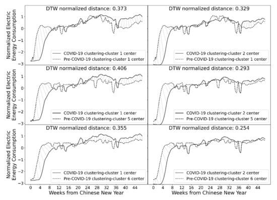 COVID-19 has made delays in the recovery of electricity consumption after the Chinese New Year holidays because of the lockdown enforced by the government. In addition, the shapes of the electricity consumption curves of some cities are also changed by the pandemic. It is shown in Figure 15, which makes a dynamic time warping (DTW) comparison between different clustering centers of the COVID-19 clustering result and pre-COVID-19 clustering result. DTW is a method to measure the similarity between two time-series sequences eliminating the effects of time shifts or different speeds. It is suitable to measure the similarity of the electric energy consumption data between the COVID-19 and pre-COVID-19 periods because it can show the trend disparity without considering the pure time delay effect caused by the lockdown policies. According to the figure, cluster 1′s center of the COVID-19 clustering has a relatively large DTW distance with all three major clusters of the pre-COVID-19 clustering, while the cluster 2 center of the COVID-19 clustering has a relatively smaller DTW distance. Cluster 6 of the pre-COVID-19 clustering has the most similar shape to cluster 2 of the COVID-19 clustering, as shown in the lower-right subplot in Figure 15. The two electricity consumption centers have similar time-series behaviors except for a two-week time shift.