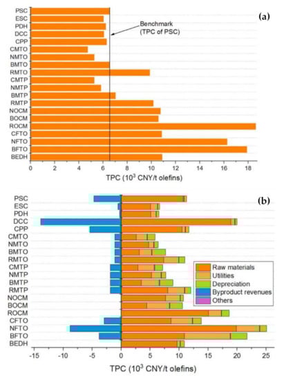 (a) Total production costs of different olefin production technologies, (b) a detailed breakdown of the TPCs of different production pathways [].