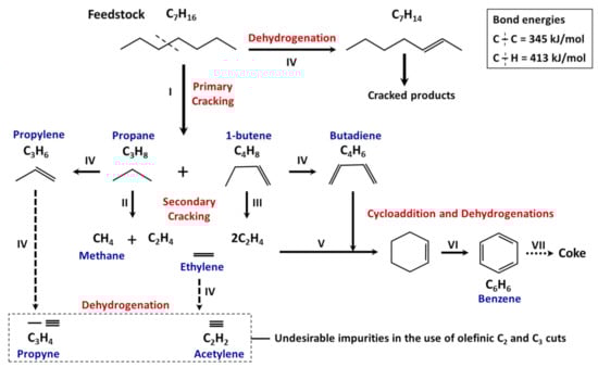 The dehydrogenation of olefins (reaction IV) can result in the formation of highly unsaturated products such as acetylene, which are known to be undesired impurities in C2 and C3 olefinic cuts, which show noticeable chemical reactivity. Heavy products can be formed via the Diels and Alder reaction or cycloaddition (reaction V). Aromatic hydrocarbons and particularly benzene are formed if the compounds formed through the cycloaddition are subjected to an intense dehydrogenation process (reaction VI). These are the natural precursors of condensed polyaromatic materials, which, according to their solid-state or pasty, are known as tar and coke (reaction VII) [,,,,,].