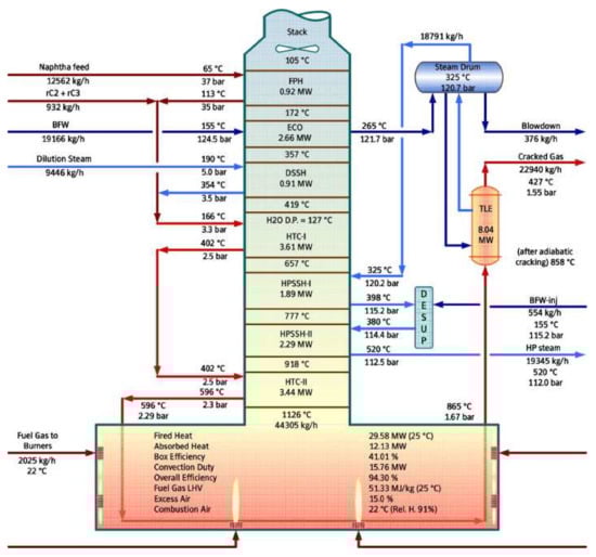 The mixture of the feed and steam is preheated in the convection section of the furnace via convective heat exchange against the hot flue gases leaving the radiant section. About 50% of the heat from flue gases is recovered in the convection section, including 35.5% for the process heat duty, which is the required energy for preheating of the feedstock and dilution steam to the incipient cracking temperature, and about 16% for the utility heating duty, which is the required energy for heating of the high-pressure boiler feed water (BFW) from 110 °C to 180 °C before entering the TLE and to superheat the saturated high-pressure steam produced in the TLEs. The mixture of feed and steam enters the reactor tube in the radiation section, and the cracking reactions occur inside the reactor tube. The flue gas temperature at the stack was observed to be above 400 °C, whereas due to the waste heat recovery in the modern and upgraded plants, the temperature of flue gases at the stack has decreased to less than 100 °C [,,,,].