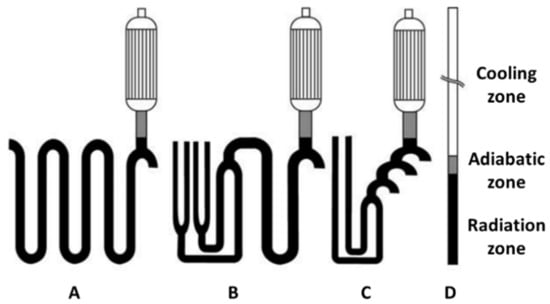In addition to the radiant coils, cracking reactions also occur in the subsequent heat-insulate transfer line, the nearly-adiabatic zone, and TLE []. Belohlav et al. [] used four different cracking coils for the kinetic model optimization (Figure 6), including (A) long single-row coils, with fixed-diameter tubes, which is usually used for gaseous feeds; (B) and (C) split coils, which are typical reactors with a short residence time of 0.2–0.8 s, with multi-diameter tubes, which are used for liquid hydrocarbons; and (D) short single-row tubes with residence times less than 0.1 s [,]. The yield of ethylene in the modelled reactors (according to the type of cracking reactor), according to the reactor designs shown in Figure 6, are given in Table 2.