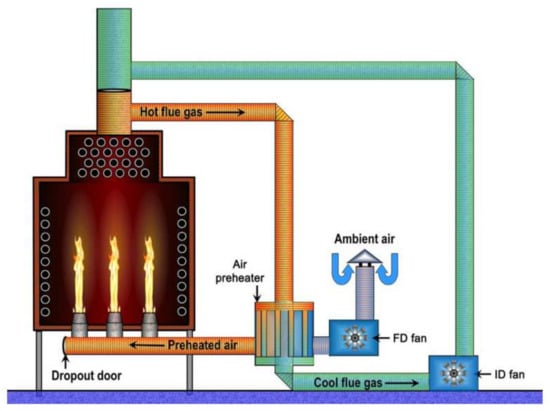 Balanced draft is a combination of ID and FD and is sometimes referred to as pull/push or FD/ID method (Figure 7). This system is used to increase the energy efficiency of a combustion process by preheating the combustion air. Ambient air and the exhaust (or flue gas) enter the air preheater, and the energy from the hot exhaust gas is transferred to the air. The temperatures of preheated air are in the range of 320–540 °C. However, higher preheat temperatures can result in considerably higher rate of NOx formation. The two fans in the balanced draft system supply the forced draft to the burners and pull the gases out of the furnace via the induced draft. Changes in weather conditions (e.g., wind direction) do not affect the balanced draft, whereas the other three types of draft (natural, induced, and forced drafts) can be affected [,].