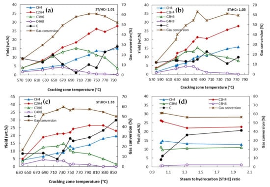 Effect of temperature at different steam-to-hydrocarbon (ST:HC) mass ratios (a) ST:HC = 1.01, (b) ST:HC = 1.03, (c) ST:HC = 1.33; and (d) the effect of ST:HC on the product yields of the thermal steam cracking of an atmospheric gas oil, reproduced from [].