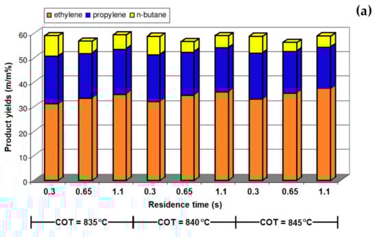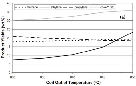 The effects of different operating conditions, including temperature, the steam-to-hydrocarbon ratio (atmospheric gas oil), and residence time, on the yield of the products, were investigated by Depeyre et al. []. As shown in Figure 8a–c, regardless of the steam-to-hydrocarbon ratio, the yields of methane and ethylene increased with the increasing of the temperature, whereas the yields of propylene and butenes reached a maximum and then decreased at higher temperatures. For the different steam-to-hydrocarbon ratios, the highest gas conversion was obtained at about 750 °C. The ratio of the total weight of the produced gas per weight of the injected gas oil used as feedstock is referred to as gas conversion. The amount of deposited carbon also increases with temperature. It has been reported that both radical reactions and molecular secondary reactions are involved in the reaction; however, in a higher-temperature reaction (above 750 °C), the molecular reactions are the dominant reactions. Gál and Lakatos [] studied the effect of coil outlet temperature (COT) on the product yields and variation in the coke formation rate, using natural gas as a feedstock for the steam cracking process. They reported that by increasing the COT from 830 °C to 845 °C, the ethylene yield increased from 30% to 35%, and increasing the temperature above 845 °C did not cause a considerable increase in the yield (Figure 9a). The yields of methane and propylene showed little changes when changing the temperature from 830 °C to 845 °C. Interestingly, the coke formation increased significantly (from 7% to 23%) when increasing the temperature.