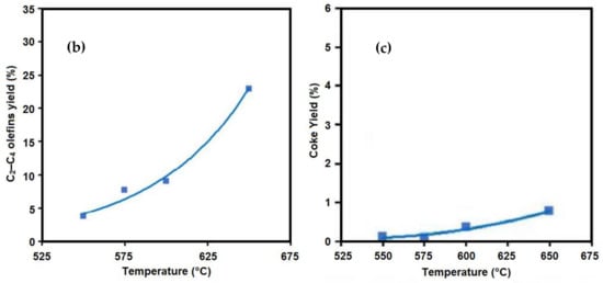(a) Effect of coil outlet temperature on the product yields []; (b) effect of temperature on light olefin yield; and (c) coke formation for the cracking of Arabian Light crude oil using thermal cracking [].