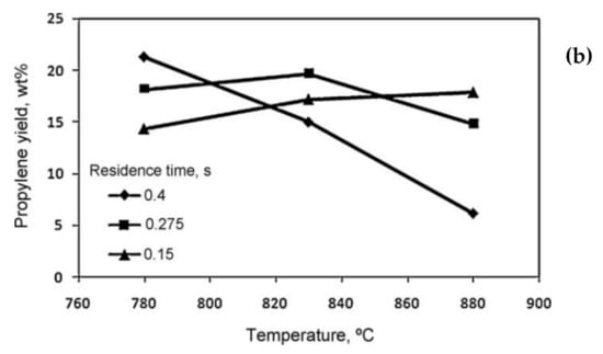 (a) Effect of residence time on the product yields [], (b) effect of residence time on the propylene yield (steam-to-oil ratio = 0.5 g/g) [].