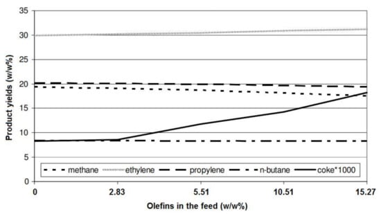 The product yield can be affected by the feed composition. This effect is more pronounced in the re-pyrolysis of recycled cracked gases, which can be mixed with the fresh hydrocarbons, and may contain a large amount of olefins and di-olefins. Gál and Lakatos [] reported that the yield of methane and propylene slightly decreased by increasing the presence of olefins in the feedstock (Figure 11); lower olefin concentration resulted in lower coke formation. The ethylene yield increased gradually by increasing the presence of unsaturated hydrocarbons in the feedstock. The dependency of product yields and the type of feedstock was studied by Dominov et al. []. The product distribution is changed by varying the feedstock composition. It can be seen that by changing the feedstock from ethane to propane and butane and liquid feedstocks, the ethylene yield decreased by more than 40%, whereas the yield of heavier olefins increased. The feedstocks of ethylene plants usually contain straight and branched alkanes, olefins, aromatics, and naphthenes.