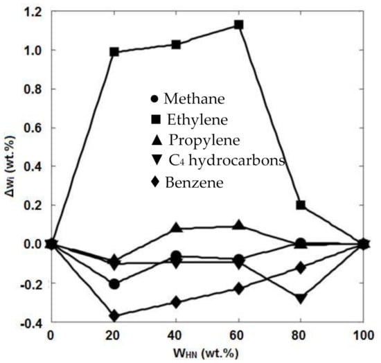 The effect of feedstock composition on the product distribution in the steam cracking process, as studied by Geerts et al. [], also revealed that the steam cracking of the naphtha fraction resulted in higher yields of ethylene and propylene (36%) than the yields of these products (28.3%) obtained from the steam cracking of wide-range gas oil (WRGO). However, the yields of pyrolysis fuel oil (PFO) and pyrolysis gasoline (Pygas) were higher when WRGO was used as the feedstock. The pyrolysis of light and heavy naphtha feedstocks and their mixtures was evaluated by Karaba et al. []. It was reported that the product distribution depended on the feedstock’s properties, and light naphtha could lead to higher yields of the light olefins. Pyrolysis of the feedstock containing 20–60 wt.% of heavy naphtha resulted in a higher ethylene yield (around 1.1 wt.% higher), whereas the addition of light naphtha to the heavy naphtha feedstock caused a decrease in the yields of methane, C4 hydrocarbons, and benzene (Figure 12). Even this slight increase in the ethylene yield could make a significant improvement at the industrial scale. For example, for an ethylene plant with 30 tons per hour of naphtha feedstock, this 1.1 wt.% increase in the ethylene yield results in an additional 330 kg of ethylene per hour per one steam cracker, which means about 300 EUR per hour per one steam cracker [].