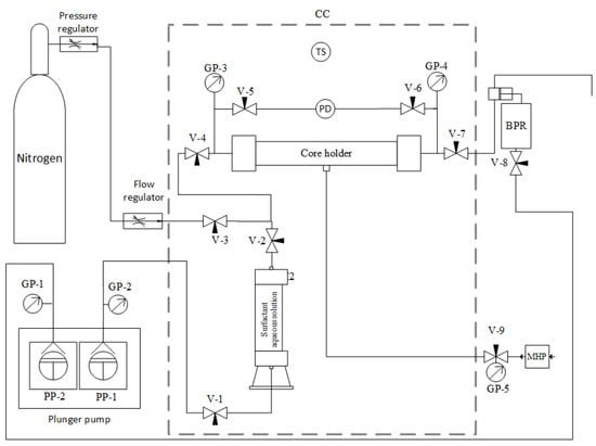 The efficiency of surfactants as foaming agents can also be estimated by the apparent viscosity of foam, which was determined by filtration tests in a porous medium [41]. Values of apparent viscosity also help to determine the optimal gas/liquid ratio. Artificial silicate-type core samples based on consolidated quartz sand were used in the experiments as homogeneous porous media. The dimensions of the artificial core samples were 5 cm in length and 3 cm in diameter. The average absolute gas permeability was 1 Darcy, and the average porosity was 13%. The most common gases used in gas and chemical methods are carbon dioxide (CO2), nitrogen (N2) and hydrocarbon gases [42,43,44,45]. Due to the high inertness of nitrogen, to compare the properties of foams in a porous medium, the high-purity nitrogen (99.999%) was used as the gas phase for generating foam, as well as a displacing agent. The filtration experiments were performed on the filtration setup according to the scheme shown in Figure 1.