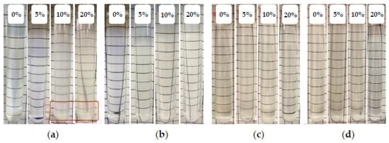 The appearance of surfactant solutions at 0, 5, 10 and 20 wt% NaCl concentrations after 30 days at 293 K: (a) SDS; (b) NP12EO, (c) NP12EO-SA; (d) NP12EO-MA.