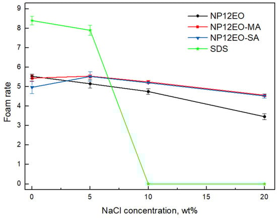 SDS showed a higher foam rate and foam half-life time at low NaCl concentrations, but generated no foam at higher mineralization due to surfactant precipitation. Ethoxylate surfactants showed a more stable foam rate which slowly decreased with increasing NaCl concentration.
