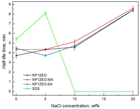 Compared with NP12EO, synthesized surfactants showed a higher foam rate at all NaCl concentration ranges, but no significant difference in half-life time was observed. At 20 wt% concentration of NaCl, both anionic–nonionic surfactants can still generate foam with a foam rate above 4.5, and the initial nonionic surfactant NP12EO can achieve only 3.5. A slight increase in foam rate at 5 wt% NaCl can be described by increasing the adsorption rate of anionic–nonionic surfactant molecules in the interfacial surface. At higher NaCl concentration, the adsorption rate of surfactants reaches its maximum level and Na+ cations only decrease repulsive forces [47]. Further increasing of NaCl concentration leads to a decrease of foam rate of both synthesized surfactants. However, a significant difference was not noticed between synthesized surfactants at all mineralization ranges. According to the measurements (Figure 4), generally, the half-life time of both synthesized surfactants increases with NaCl concentration. However, at 5% NaCl concentration, half-life time of anionic–nonionic surfactants decreased or remained the same. The same effect was observed in the work of [48], where authors considered liquid drainage in lamellas versus NaCl concentration. The authors showed that in the NaCl concentration ranges from 0 wt% to 18 wt%, the maximum rate of drainage was obtained at 5 wt% NaCl. Further increasing of foam half-life time at higher NaCl concentrations was also described by bubbles coalescence time increasing due to decreasing of surface tension [49].