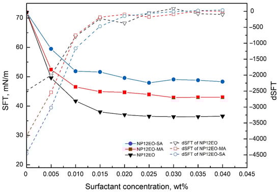 In Figure 5, the effect of surfactants addition in distilled water on the surface tension (SFT) at 293 K and atmospheric pressure can be seen. In distilled water, the surface tension of all surfactants decreases rapidly and reaches its stable SFT values at a concentration of less than 0.025 wt%. According to dSFT values, NP12EO-SA, NP12EO-MA and NP12EO reach CMC at 0.02 wt%, 0.015 wt% and 0.015 wt%, respectively.