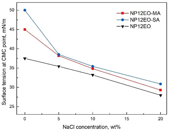 The effect of NaCl on the surface tension at the CMC point (γCMC) is shown in Figure 6. In general, for all surfactants, a sharp decrease of SFT during NaCl concentration increasing was observed. It is well known that the mineralization of solution strongly affects surface tension values [45]. From the obtained results, the sodium chloride concentration affects more on the surface tension of surfactants with the ionic group due to the increasing concentration of adsorbed surfactants in the interfacial boundary; the higher number of molecules of surfactants, the less SFT [55]. However, there is a slight difference in SFT values between synthesized surfactants: at 0.015 wt% SFT of NP12EO-MA is 45 mN/m, while the SFT of NP12EO-SA at 0.02 wt% is only 50 mN/m.