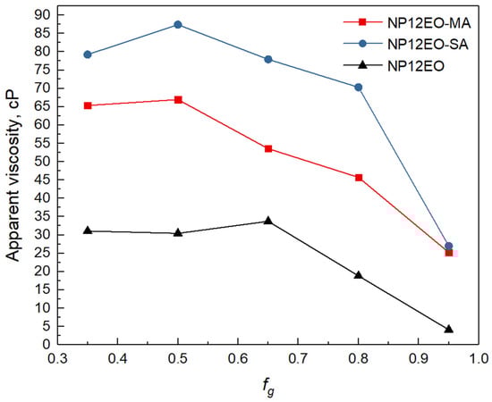 The apparent viscosity of foams in porous media for each fg (Figure 7, Table 2) was calculated Equation (1) for both synthesized and initial nonionic surfactant after the stabilization of the pressure drop. The highest apparent viscosities of a synthesized surfactant were obtained at fg = 0.5, for NP12EO at fg = 0.65. Depending on shear rate, foam can exhibit shear-thinning and shear-thickening behavior [56] that mostly appear at a lower or higher foam quality range. At foam quality range fg = 0.5–0.65, the apparent viscosity of the foam has minimum dependence on shear rate [57] which was chosen as optimal foam quality. At this range of apparent viscosity, foam can be used in a fairly wide range of injection rates.