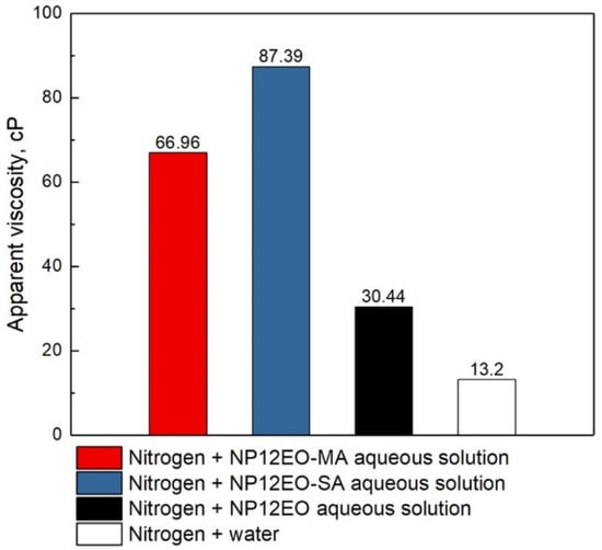 Apparent viscosities of foams were compared at the same fg = 0.5 to apparent viscosity of nitrogen and water mixture (Figure 8). The gas–water system, due to multiphase flow, creates filtration resistance; however, the addition of surfactant decreases the surface tension and energy required to create more surface area between gas and water, which led to increasing apparent viscosity of more than five times.