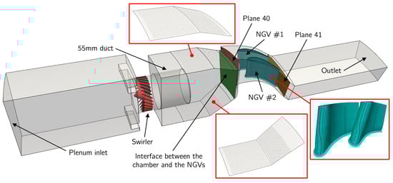 The meshes are, respectively, composed of 29.6 M cells for the plenum/combustion chamber region and 12.4 M cells for the two stator blades. Refinement regions ensure a maximum of 120 for the blades, 80 for the chamber walls, and 100 for the turbine (the maximum is at the trailing edge). All walls are considered adiabatic and, according to the values, the near-wall region is modeled by a logarithmic wall law [30]. Note that being given the objective of carrying out several isolated simulations with different inlet boundary conditions, the mesh is deliberately not very refined to keep a low computational cost.