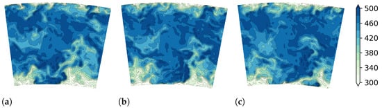 Visualization of the static temperature at different instants from the database. (a) Instant . (b) Instant . (c) Instant .
