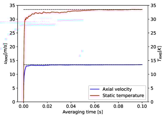 Spatial averages of the RMS values for the axial velocity and static temperature at the turbine inlet as a function of the averaging time. The black dashed lines correspond to the final value for an averaging time of 0.1 s.