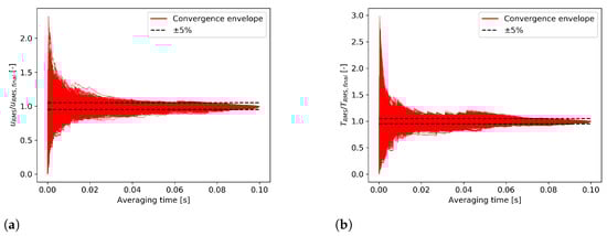 Convergence envelope of the local RMS values for the axial velocity and static temperature at the turbine inlet as a function of the averaging time. The dashed lines define the limits. (a) Axial velocity. (b) Static temperature.