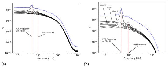 The SPOD spectrum obtained with these parameters contains a total of seven modes and is presented in Figure 5. The eigenvalues are normalized by the sum of the total energy on all the frequencies and modes. The blue line corresponds to the power spectral density which is reconstructed by summing the energies of each mode for all the frequencies of the spectrum. Mode 1 clearly evidences the frequency of the PVC at 500 Hz, as well as its first harmonic at 1000 Hz.