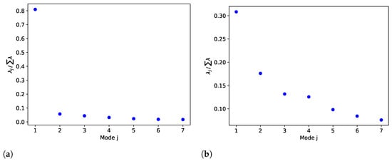 SPOD eigenvalues at two given frequencies. (a) 500 Hz. (b) 1000 Hz.
