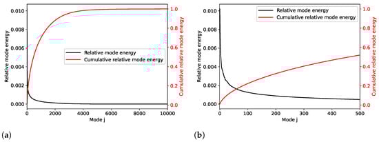Relative contribution of the POD eigenvalues in the overall turbulent kinetic energy. (a) All eigenvalues. (b) Zoom on the first 500 eigenvalues.