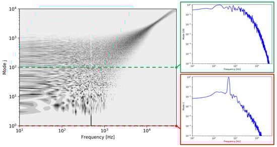 Another interesting illustration is given in Figure 10. It represents the power spectral density of each POD temporal coefficient with contour normalized by the maximum value of its power spectral density (PSD). For a given mode j, this means that for a given frequency along the x-axis, the darker the color, the closer its level is to the PSD maximum of the POD temporal coefficient of mode j. For example, the red dashed line associated with mode 1 shows that its temporal coefficient mainly contained the frequency associated with the PVC at 500 Hz. This is also the case for mode 2. On the contrary, for the rest of the modes, the large number of frequencies are close to the maximum of the power spectral density. The second plot shows the PSD of mode 100 located along the green dashed line. It is clear that no frequency dominates over the others. This representation highlights the preceding remark: the temporal coefficients of the eigenmodes obtained by POD contain a wide range of frequencies and the associated modes thus represent a behavior of the flow which combine several time scales, which was not the case for the SPOD.