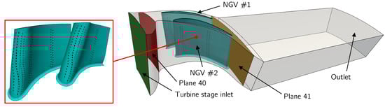 In the following, a first configuration including both the combustion chamber and the first row of turbine blades (also known as nozzle guide vanes, NGV) is considered (Figure 1). In a previous study, it was shown that this type of simulation was able to accurately reproduce the effects of temperature nonuniformities generated by the chamber [22]. Thanks to the periodicity property of the initial configuration, only a sector of 18 is simulated with an alignment between the injector and the leading edge of the second stator blade.