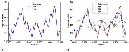 To give a better idea of the characteristics of the signals imposed for cases F99, F90, F65, F20, and F10, Figure 14 plots the evolution of the spatial average of the static temperature at the inlet plane obtained by reconstructions behind the five cases compared to the reference case (the initial database) for a period of 0.005 s. The frequency cutoff of the SPOD spectrum is, here, clearly visible in each case. It is also clear that case F99 very well reproduces the rapid changes in temperature seen in the reference. For case F90, the global trend is respected, but the rapid variations (which are therefore at high frequencies) are smoothed out. This behavior is even more marked for F65. For cases F20 and F10, whose reconstruction contains only a limited number of frequencies, the evolution is as expected even more simplified. Finally, for case F10, only the oscillation at the 500 Hz frequency is present.