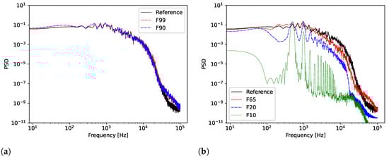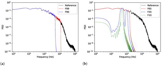 Power spectral densities of the axial velocity signal obtained from the isolated simulations of a probe located at the center of plane 40 (red plane of Figure 11). (a) F99, F90. (b) F65, F20, F10.