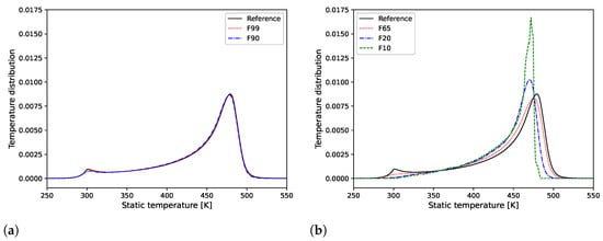 Finally, and in order to illustrate the impact of the injected signals on the full LES predicted flow field, the static temperature distribution for all the nodes of plane 40 and for the 20,000 snapshots of the database is given in Figure 17. For the reference, as well as for cases F99 and F90, a peak is observed at 300 K which corresponds to the injection temperature of the cold flow by the multiperforations. At the chamber/turbine interface, these extreme temperature values are still visible. The second peak is located at a value around 513 K (injection temperature of the hot flow of the plenum). For F65, the peak at 300 K is hardly visible, and even disappears completely for cases F20 and F10. This is simply due to the fact that the fluctuations imposed at the inlet are no longer sufficiently large to consider and capture this extremum. As the reconstruction becomes more and more incomplete, the width of the temperature distribution is reduced and the extreme values are no longer reached by the boundary condition [40].