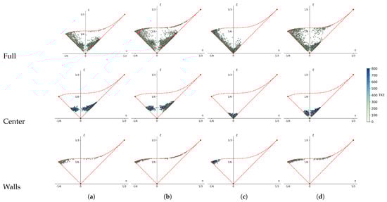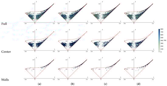 Downstream of the vane, i.e., at plane 41, for the SPOD cases, observations are similar (Table 5). The cases using a large part of the energy in the reconstructions have values very close to the reference. Likewise, the cases without turbulence injection have very low fluctuation values. Note that for the cases T0 and T2, although the levels of TKE in plane 40 are identical to the reference, levels at plane 41 are significantly lower than the reference. As for plane 40, the turbulence triangles of F99, F65, T0, and T2 are shown in Figure 19. For F99 and F65, from the values given in Table 5, one could think that the turbulence had become isotropic after the vane. However, the turbulence triangles for the nodes located in the channel center show that it is not the case. The nodes remain far from the lower corner of the triangle which corresponds to isotropic turbulence. For cases T0 and T2, the turbulence properties are close, despite the lower level of turbulence intensity.