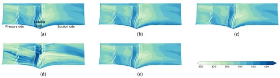 Average adiabatic wall temperature of blade #2 (K). (a) Ref. (b) F90. (c) F65. (d) S2. (e) T2.
