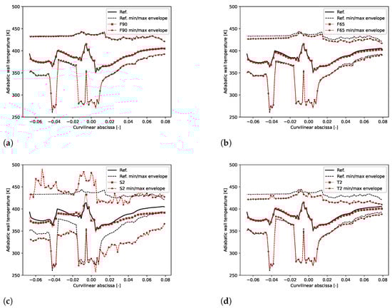 Evolution of the average adiabatic wall temperature (temporal average and averaged along the radial direction) along the curvilinear abscissa of blade #2 with the envelope of minimum and maximum values. The zero of the curvilinear abscissa corresponds to the blade leading edge. Negative values correspond to pressure side and positive values to the suction side (a) F90. (b) F65. (c) S2. (d) T2.