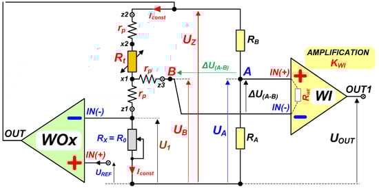 Operational amplifiers have been known for many years in electronics, and due to their well-known properties, they are still used in many applications [,,,,,]. The amplifier marked as WOx in Figure 2 acts as a current source, whose task is to stabilize the current in the bridge branch, including the resistor Rt. On the other hand, the instrumental amplifier marked as WI acts as a scaling circuit for the output voltage representing the measured temperature [,].