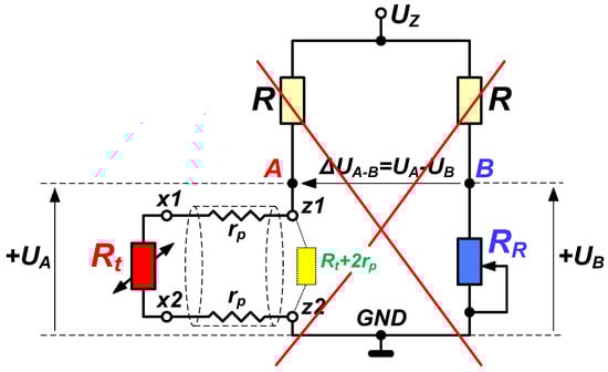 Figure 7 shows the method of connecting the Pt100 sensor in a measuring amplifier circuit with the structure of a resistive measuring bridge. The resistance rp of the connection wire between the z2 and x2 terminals was connected to the bridge branch, in which the Pt100 measuring thermoresistor was located. The resistance rp of the connection wire between the z1 and x1 terminals was connected to the bridge branch, in which the reference resistor RX = R0 was located. This method of connection effectively eliminates the influence of the wires resistance rp. This property is due to the fact that the resistance of the connection wires rp in this connection adds simultaneously to the resistance of the thermoresistor (Rt + rp) and the reference resistance (R0 + rp) in the corresponding branches of the measuring bridge. On the other hand, such a connection does not disturb the balance of the measuring bridge because the changes in the resistance rp value (also due to temperature changes) take place simultaneously in both branches of the measuring bridge included in the measuring amplifier circuit (Figure 2).