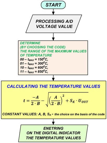 By applying the voltage within the range Uout = 0 ÷ 5 V to the input of the A/D converter, it is possible to control the correct intermediate indications of the TC temperature values. For example, for calibration of the calculating system indications, the following relation was assumed: TC (°C) = 0 ÷ 850 → UIN−A/D = 0 ÷ 5 V. Table 3 presents the calculated intermediate values of the voltage UIN A/D for the range of the temperature value measurement TC = 0 ÷ 850 °C.
