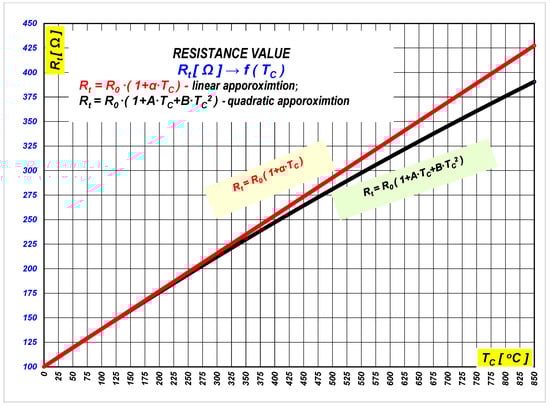 After the transformation of Formula (39), the resistance value Rt is determined for the range of the temperature value changes TC = 0 ÷ 100 °C. Formula (39) should be applied for the temperature measurement TC_MAX = 100 °C. This is the so-called linear approximation. For the temperature measurements TC_MAX ≥ 100 °C, even up to 850 °C, Formula (7) should be used—the so-called quadratic approximation [,,,].