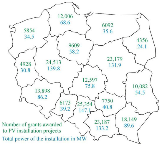 When deciding to purchase/build an RE installation, it is worth using a subsidy/loan/financial relief. First, it is necessary to check whether there are funds for RE in a given town, commune, poviat, or Voivodeship and whether there are funds for investment in the national program or the EU program. For example, the “My Electricity” program allows one to obtain funding for the building of small photovoltaic installations (between 2 kW and 10 kW) in the form of a subsidy for up to 50% of the costs, but this is no more than PLN 5000 (in 2021, PLN 3000) for one project. Figure 2 shows the results of the “My Electricity 2” program [59]. The green color indicates the amount of co-financing granted to PV installation projects, while the black color indicates the installation power in a given Voivodeship (kW).