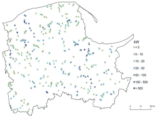 There are 22 biogas plants in operation in the Voivodeship, with a total capacity of 21,843 MW (data from the Energy Regulatory Office [78]; 20 biogas plants according to the Pomerania Spatial Planning Office [75]). According to the register of agricultural biogas producers, 10 agricultural biogas plants operate in the Pomerania Voivodeship (Table 5).