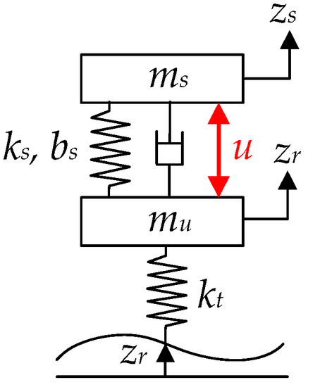 Figure 2 shows a 2-DOF QC model, which describes the vertical motions of sprung and unsprung masses. As shown in Figure 2, the control input u generated by an active suspension is located between the sprung and unsprung masses, ms and mu. The disturbance is the road profile, zr.