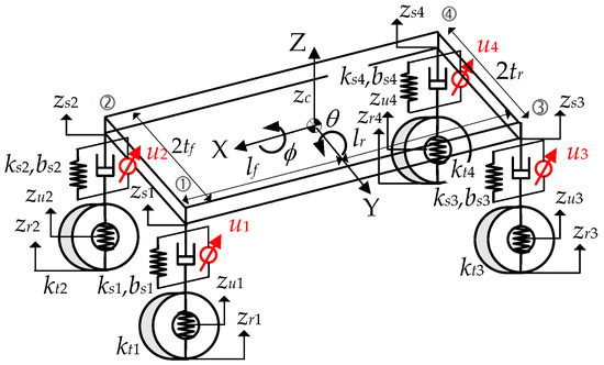 Figure 3 shows a 7-DOF FC model, which describes the vertical, roll and pitch motions of a sprung mass, and the vertical motions of four unsprung masses. As shown in Figure 3, the indices of a suspension are in order of front left, front right, rear left and rear right ones, represented as ①, ②, ③ and ④, respectively. In the FC model, there are four external disturbances, i.e., the road profiles, zr1, zr2, zr3 and zr4, on the unsprung mass. Actuators located between the sprung and unsprung masses can generate the control inputs, u1, u2, u3 and u4, at each suspension.