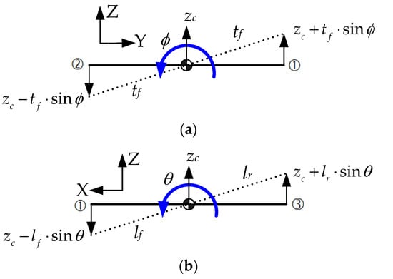 Roll and pitch motions of the sprung mass. (a) Roll motion (front view); (b) Pitch motion (side view).