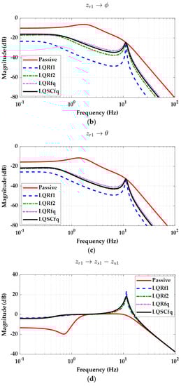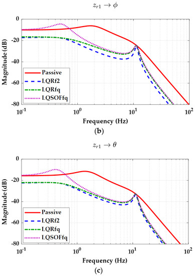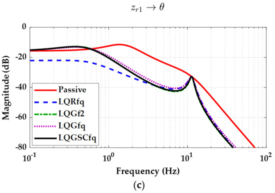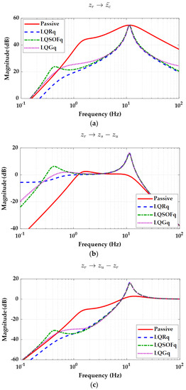 The third type of frequency-domain analysis is done for the observer-based controllers, i.e., LQG. Figure 7 shows the frequency responses of each output from the road profile zr with the QC model for LQRq, LQSOFq and LQGq, as given in (60).